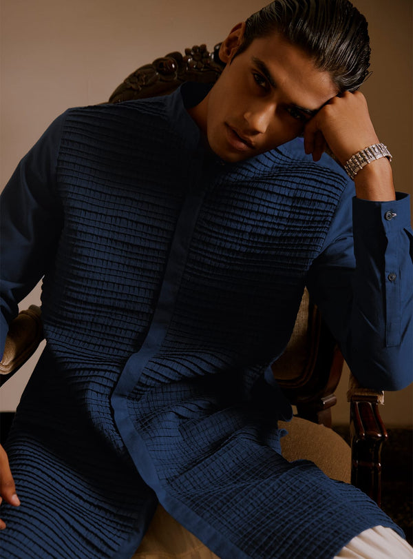 Presenting the Raatri Cotton Kurta, a contemporary style rooted in Indian heritage. Crafted from 100% cotton, this navy blue kurta features all-over pin tucks and pleats, adding a lot of depth and texture to the garment. The fabric's durability ensures long-lasting wear, while the intricate detailing provides just the right amount of style to rise to any occasion. Also features pockets for added functionality. Pair it with linen trousers for a modern aesthetic, or mix & match it with classic traditional bottoms to complete the look. Built on a legacy of excellence, each hand-crafted piece features minor variations in shade and texture, making it truly one-of-a-kind. Part of the MIRAI collection, where contemporary styling meets heritage fashion.