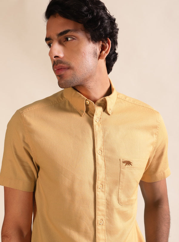 This shirt is meticulously crafted from cotton in a dobby weave, ensuring comfort and breathability. Designed in a half-sleeve silhouette, it not only provides sophistication but also features a button-down collar, & Rajan, the mark of Andamen.
