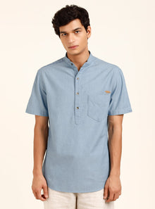 Presenting a timeless indigo shirt, made entirely from a rich Indian cotton in a textural dobby weave. This classic garment is enzyme washed to achieve the right color tone, richness & depth. This process breaks down the garment, making it super soft & giving it a gorgeous faded look. Your Indigo shirt will fade with each wash, ageing beautifully over time. Features a mandarin collar & Rajan, the mark of Andamen.