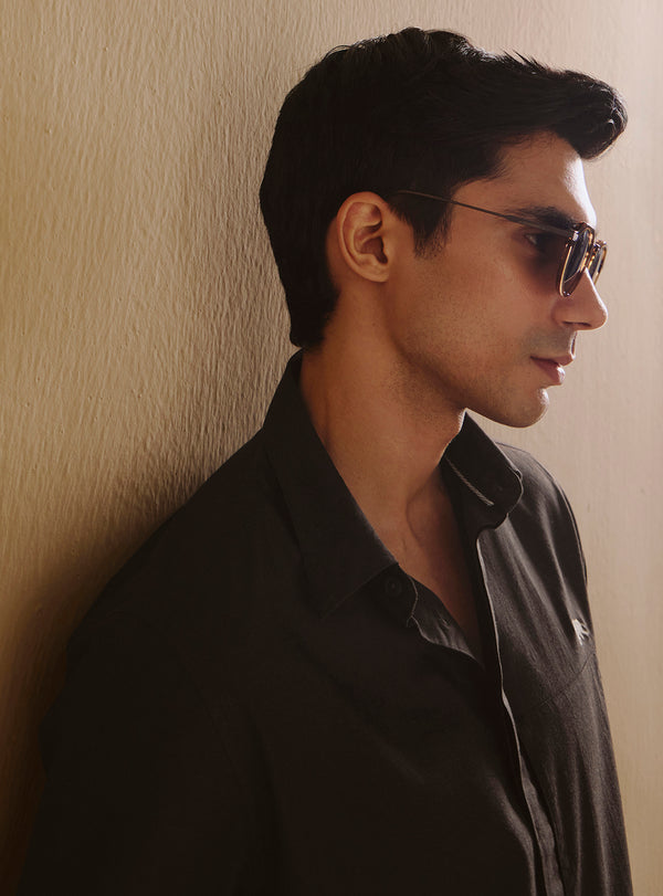 A mid-weight cotton-lycra shirt with an earthy brown tone and refined melange texture. Designed for ease with concealed placket detailing and a contemporary chest-pocket design.