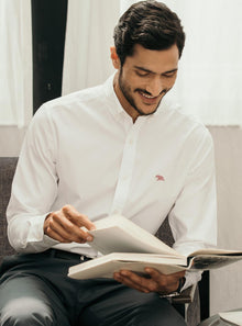 A magnificent white workwear shirt. Made in a rare, double 80s yarn for a soft hand feel and an elevated look. The Oxford fabric makes the shirt very durable to wear all year round; its weight and density is just right'. Features the mark of Andamen, the swimming elephant. The mark is also available in - Teal & Jade