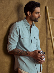 Presenting a casual shirt from our iconic "Escape" collection. Immerse in the rugged & rustic experience, made from 100% rich Indian cotton in a timeless twill weave. Preferred care: Machine wash cold, gentle cycle & tumble dry. Features front flap pockets, a button-down collar & Rajan, the mark of Andamen.