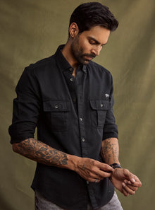 Presenting a casual shirt from our iconic "Escape" collection. Immerse in the rugged & rustic experience, made from 100% rich Indian cotton in a dobby weave. Preferred care: Machine wash cold, gentle cycle & tumble dry. Features front flap pockets, a button-down collar & Rajan, the mark of Andamen.