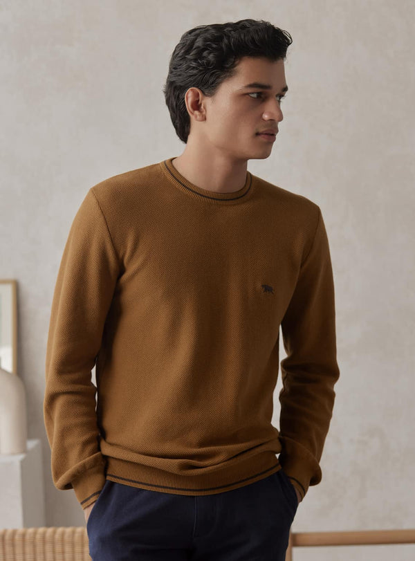 Comfortable, draped to perfection, & cosy in commotion. This full-sleeve pullover features in our Art of Leisure collection. Made entirely from cotton, this flat knit is relaxing and easy to wear. Features tipping detail, & Rajan, the mark of Andamen.