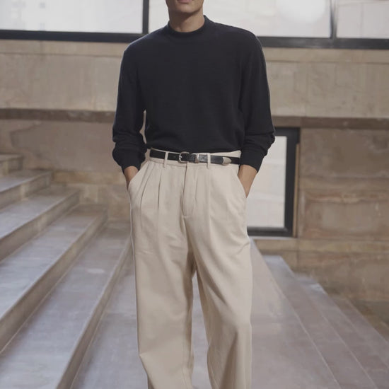 Where structure meets serenity. This mock-neck pullover in a cotton-wool blend delivers subtle texture, breathable warmth, and elevated design discipline. Tailored for form, made for freedom.