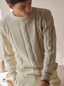 This pullover is crafted from a blend of locally sourced cotton, the superior quality of the yarn combined with our meticulous craftsmanship ensures your garment is as comfortable as it is long-lasting, and the addition of wool adds thermoregulation properties to the garment. Features cables, & Rajan, the mark of Andamen.