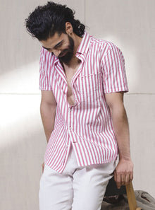 The seersucker fabric is woven in twin beam looms that weave at different speeds that cause the fabric to stay away from your skin. The fabric is lightweight and dries quickly making it a great choice for hot and humid days. The red and white stripes render perfectly for casual weekends and vacations.