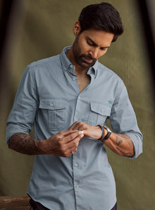 Introducing a casual shirt from our iconic "Escape" collection. Indulge in the resilient & versatile experience, made from a rich Indian cotton blend in a timeless twill weave. Preferred care: Machine wash cold, gentle cycle & tumble dry. Features front flap pockets, a button-down collar & Rajan, the mark of Andamen.