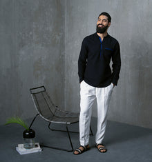 The fourth in the series of 'Sexy Saddy', one of our most iconic silhouettes, in a unique colour combination. This one is made in a double cloth with a beautiful balance between a black and an electric blue. Works particularly well for rolling up your sleeves, or leaving your buttons open - you won't see a faded reverse, instead, a pop of blue will show through and add a lot of character to the look.