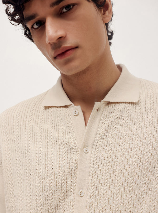 Crafted from 100% cotton, this shirt features a refined cable knit that adds depth and texture while keeping it soft, breathable, and naturally comfortable. A timeless piece that blends classic craftsmanship with modern ease.