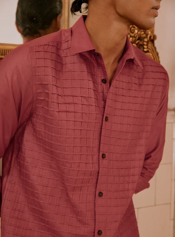 Presenting the Gulaab Cotton-Silk Shirt, a contemporary style rooted in Indian heritage.Crafted from a blend of cotton and Chanderi silk, this full-sleeve shirt in a subtle shade of red epitomises elegance and celebration. Features intricate box pintucks at the front, adding volume and visual interest. A joyous garment with its understated sheen, combining silk's softness with cotton's resilience, making this statement piece truly last.Pairs beautifully with beige muted bottoms, perfect for any intimate celebration.Built on a legacy of excellence, each hand-crafted piece features minor variations in shade and texture, making it truly one-of-a-kind.Part of the MIRAI collection, where contemporary styling meets heritage fashion.