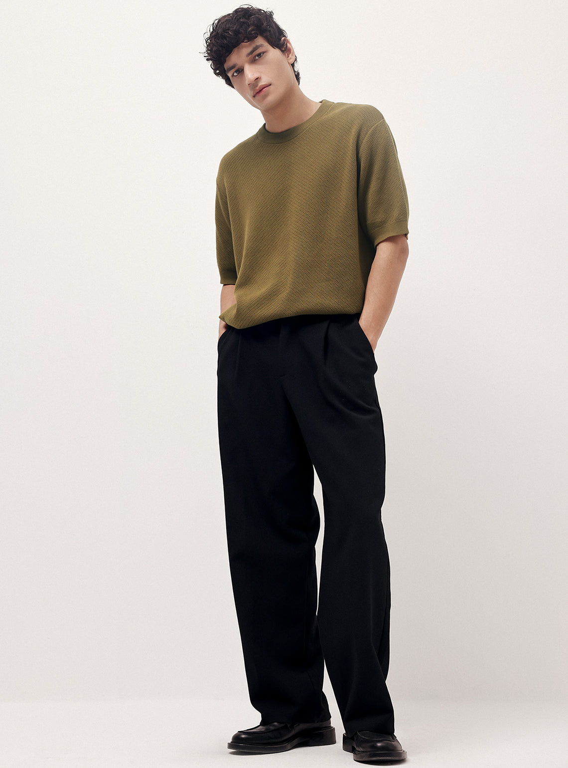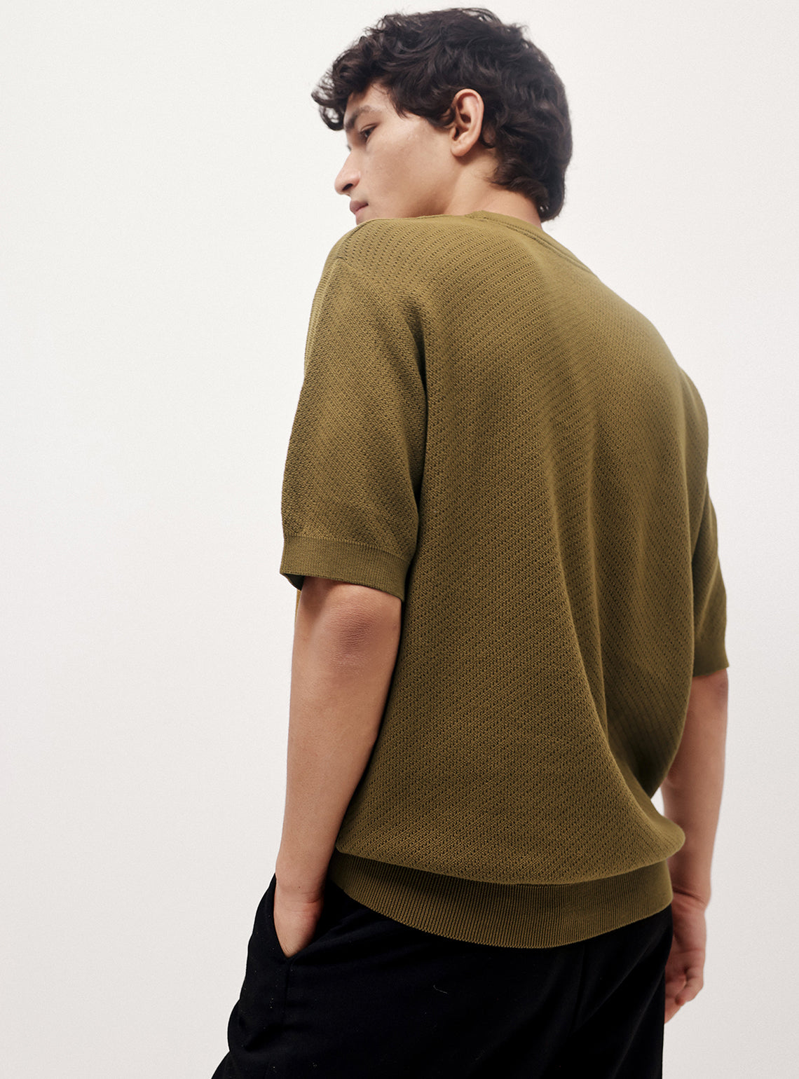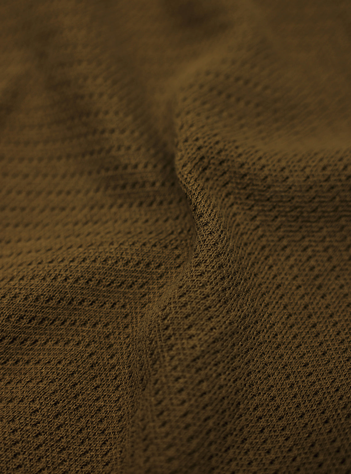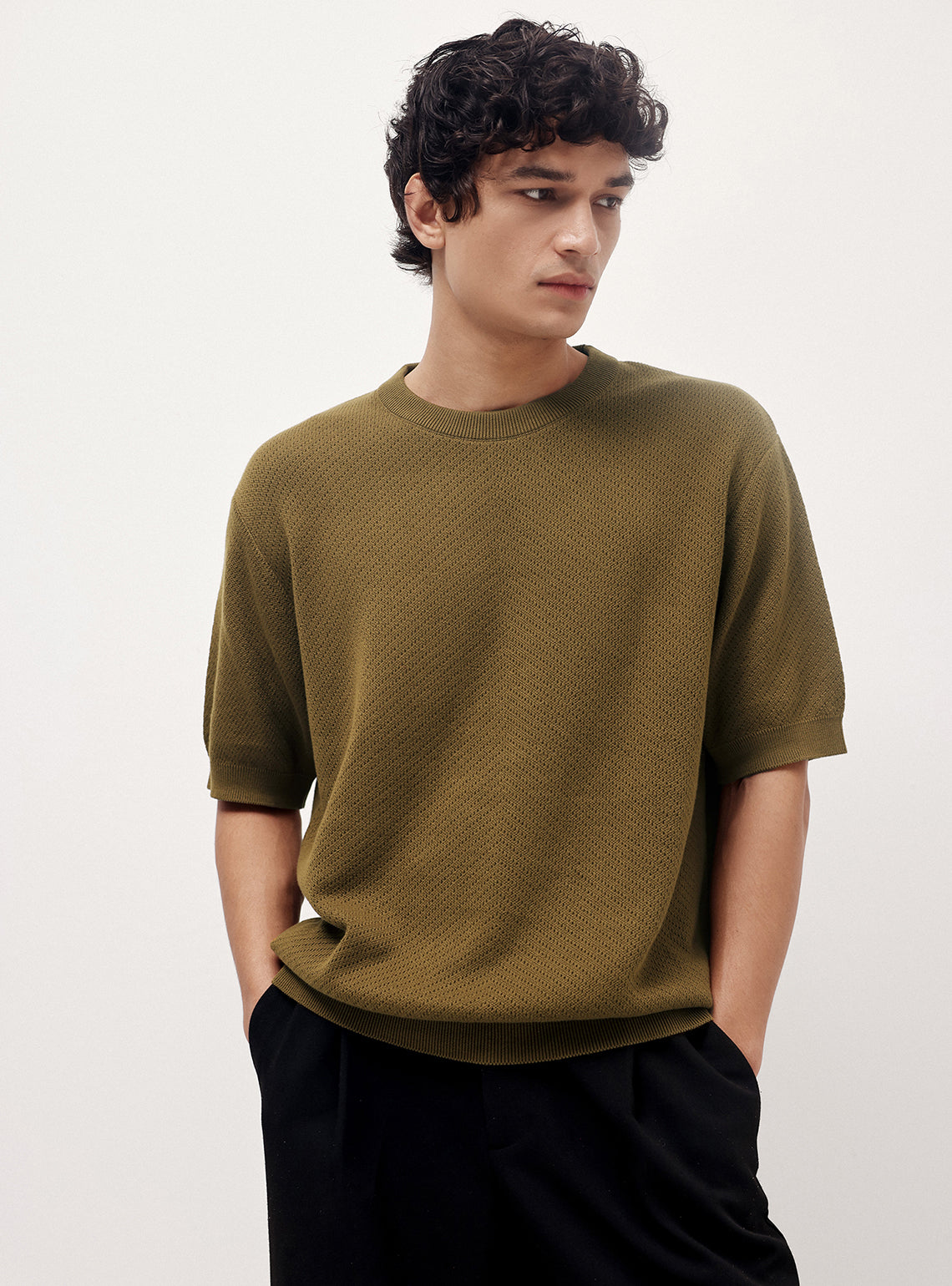 Woven from 100% Indian cotton of remarkable purity, this textured crew delivers understated refinement. Naturally soft and breathable, the fabric offers a smooth, enduring wear. It resists fraying, minimises creasing, and holds its colour over time.