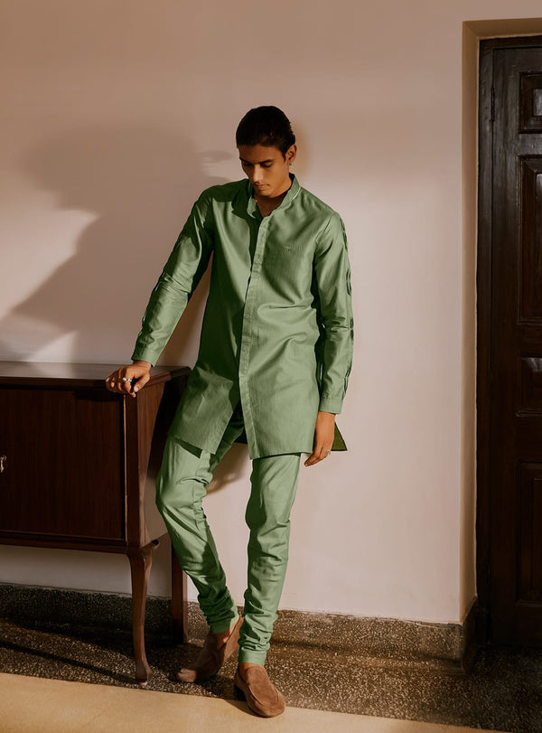Presenting the Sage Silk Churidar, a classic piece rooted in Indian heritage.Crafted from 100% mulberry silk, this solid sage churidar is lightweight and timeless. The silk fabric offers a lustrous sheen and exquisite drape, ensuring opulence with every wear. The 2-ply weave enhances durability and resilience, while the spun silk in the weft adds subtle complexity and tactile appeal.The churidar silhouette is a traditional favourite, known for its snug fit and elegant look. Pair it with kurtas for an intimate celebration Built on a legacy of excellence, each hand-crafted piece features minor variations, making it truly one-of-a-kind.Part of the MIRAI collection, where contemporary styling meets heritage fashion.