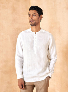 Enjoy the beautifully evolved texture and aesthetic of this popover, crafted from one of Earth's friendliest fibers, Belgian linen. Linen from Belgian flax is softer and more durable. This style is gorgeously coloured and also features handcrafted potli buttons for a true heritage look. It ages beautifully with you, becoming softer with each wash. Also features the mark of Andamen, Rajan the swimming elephant.