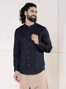 A unique, 100% linen, where the flap can be changed to either end of the metallic button. The beauty of this shirt lies in the simplicity of the fabric and the unique, contemporary Indian silhouette. Best worn for easy summer gatherings.