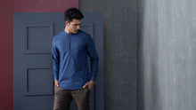 One of our most popular styles - a signature collarless shirt with fabric buttons and Man????Rajan' embroidery. It's a shirt that pushes the boundaries of versatility. Pair it with lightweight trousers or smart denims for a casual occasion, or even with jodhpuris for a formal event. The fabric is a gorgeous Giza dobby. Which means that it is very soft and durable with the right amount of sheen.