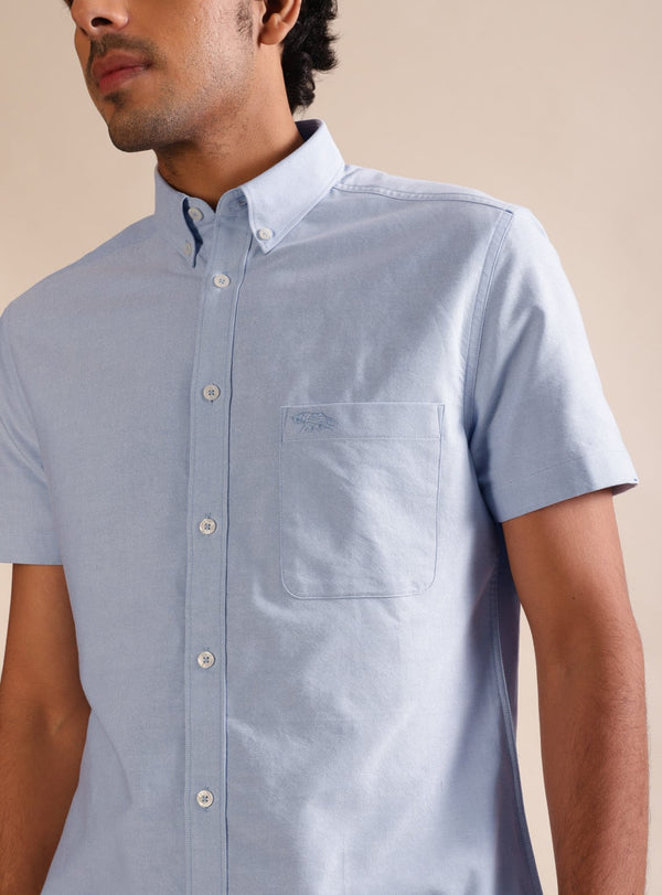 This shirt is meticulously crafted from cotton in a plain weave, ensuring comfort and breathability. Designed in a half-sleeve silhouette, it not only provides sophistication but also features a button-down collar, & Rajan, the mark of Andamen.