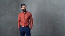 Close your eyes and pick this shirt for any evening you have to go out for. It has a beautiful rust and navy palette which works well for special occasions and festivals. Features a slim, concealed button-down collar. A perfectly constructed chiseled cuff. Andamen waves insignia. A zero seam French placket construction.