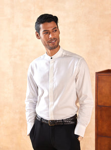 Presenting a timeless evening shirt, in a classic white color. Made from a rich Indian cotton, in a textural dobby weave that adds sharpness & depth to the fabric. Features a mandarin collar, a concealed button placket for a minimal look & insignia embroidery on cuffs.