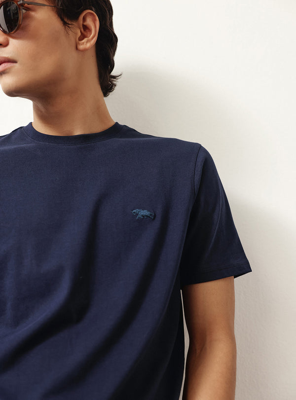 Crafted in compact cotton, this navy crew offers refined texture and breathable comfort. A timeless essential that pairs seamlessly across seasons.