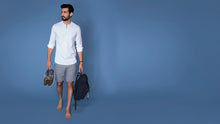 One of our most popular styles - a signature collarless shirt with fabric buttons and ?????Rajan' embroidery. The fabric is a gorgeous 2/100's Giza dobby. Which means that it is very soft and durable with the right amount of sheen. Style it easily for Indian occasions, for a casual weekday or for your holidays.