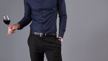 Amp up your evening wear with this sophisticated navy and grey striper. The blocking, in self fabric, is distinguished and minimal. The details keep unfolding as you discover the entire shirt. The fabric is a 2/100's Egyptian Giza, the handle is crisp, not very soft, because of the m?lange.