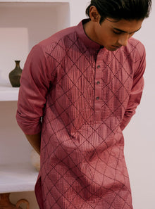 Presenting the Gulaab Cotton-Silk Kurta, a contemporary style rooted in Indian heritage.Crafted from a blend of cotton and Chanderi silk, this full-sleeve, long-length kurta in a subtle shade of red epitomises elegance and celebration. Featuring intricate cross pleats and geometric running stitch lines at the front, adding volume and visual interest. A joyous garment with its understated sheen, combining silk's softness with cotton's resilience, making this statement piece truly last.Pairs beautifully with the traditional bottom of your preferred cut, perfect for any intimate celebration.Built on a legacy of excellence, each hand-crafted piece features minor variations in shade and texture, making it truly one-of-a-kind.Part of the MIRAI collection, where contemporary styling meets heritage fashion.