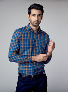 A rule of thumb is that when patterns are involved in a shirt, one should pair it with a plain, or solid suit or pants. Though we normally experiment with most such rules, for best results in a vibrant check like this one, we say – stay classic. Pairs best with a navy jacket and navy pants. For an extra punch, style it with an orange pocket-square.