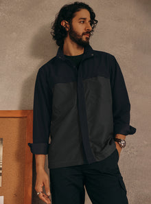 A relaxed overshirt in heavy poly twill with structured cut-and-sew panels. Mesh back vents provide ease of movement and wearability.