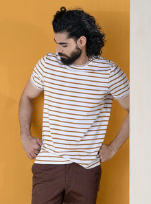 Breeze into summer. Discover alternating stripes of mustard and white in a tee that is airy, breezy and luxurious. Made from the best cotton in the world, 100% certified Supima Cotton which gives the tee a superior, soft handfeel and lustre.