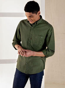 This casual olive twill is great for an elevated essential wardrobe pick. It's brushed, which makes it incredibly soft and comfortable for repeated and long wearing. And while from a distance it looks like a simple shirt, up close the detailing really comes through. Great for travel and weekends. We recommend that you pair it with your favourite denim or navy, grey or brown chinos.