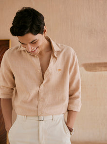 Made from 100% European linen, this shirt brings together purity and purpose. The fabric, European Linen, is woven from Belgian flax that grows with rainwater alone & is naturally breathable, soft, and strong.
