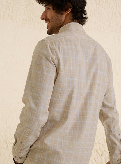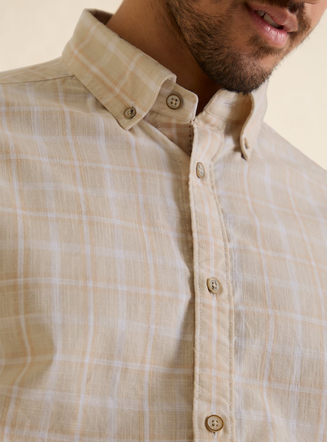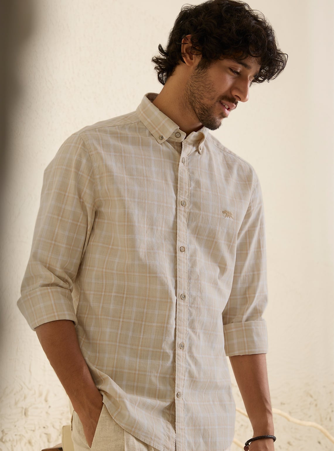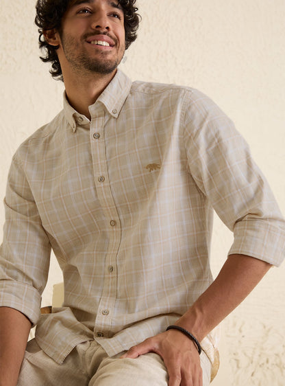 Timeless, soft to touch & naturally breathable. Presenting a casual shirt, crafted entiely from a rich Indian cotton in a plain weave. The special yarn results in a textured look & an enhanced color depth. Features a button-down collar & Rajan, the mark of Andamen.
