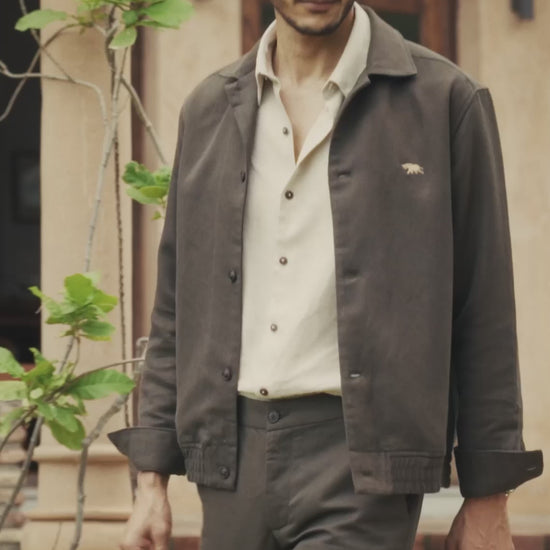 Crafted from a blend of premium cotton and European linen, this bomber refines a classic silhouette. The linen, made from Belgian flax, keeps it light and cool, while cotton adds softness and strength. A subtle dobby stripe weave lends quiet texture and dimension.