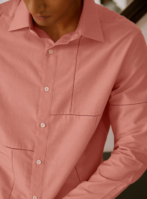 Introducing the Jaipur Cotton-Silk Shirt, a contemporary style rooted in Indian heritage.This shirt is crafted from a luxurious blend of handspun cotton and mulberry silk, epitomising true elegance in a popular pink-salmon hue. It features exquisite fagotting details that add depth to the garment, while intricate openwork stitching creates a delicate pattern, making it a standout piece.While the silk lends a lustrous sheen and exquisite drape to the garment, the cotton adds to its overall softness and durability, ensuring an indulgent hand-feel and wear experience.Built on a legacy of excellence, each hand-crafted piece features minor variations in shade and texture, making it truly one-of-a-kind.Part of the MIRAI collection, where contemporary styling meets heritage fashion.