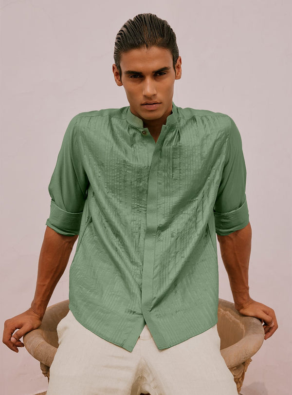 Introducing the Khas Viscose-Silk Shirt, blending modern aesthetics with a nod to tradition.Crafted from a luxurious blend of viscose and silk, this Shirt in sage showcases an all-over pleated pattern and a full-length placket, combining a contemporary silhouette with traditional charm.The silk lends a subtle sheen and smooth drape to the fabric, while viscose ensures softness and comfort throughout wear.Pair it with white linen pants within the spectrum of white shades for a modern aesthetic look.Part of the MIRAI collection, where contemporary styling meets heritage fashion.