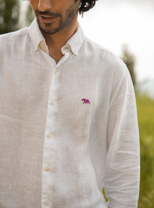 A timeless white linen shirt. Lightweight, naturally breathable, and cool to touch. This shirt is crafted from one of Earth's friendliest fibre, Belgian linen. Flax from Belgian linen is softer, more durable, and 100% bio-degradable. Features a button-down collar and the mark of Andamen, the swimming elephant. It also ages beautifully with you, becoming softer with each wash. Also comes in short sleeves.