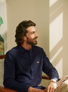 The richness of Indigo in a mandarin collar. This shirt is crafted from the luxuriously soft, Indigo cotton in a mid-weight fabric. The natural Indigo dye will fade out over time, making the shirt better, softer, bluer over wears and washes. Accentuated with natural wooden buttons that give each button a rustic variance. Also features the mark of Andamen, Rajan the swimming elephant.
