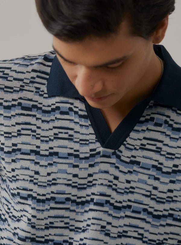 This polo is meticulously crafted from cotton ensuring comfort and durability. Designed in a half-sleeve silhouette, it not only provides sophistication but also features jacquard fabric, pixel waves design, & Rajan, the mark of Andamen.