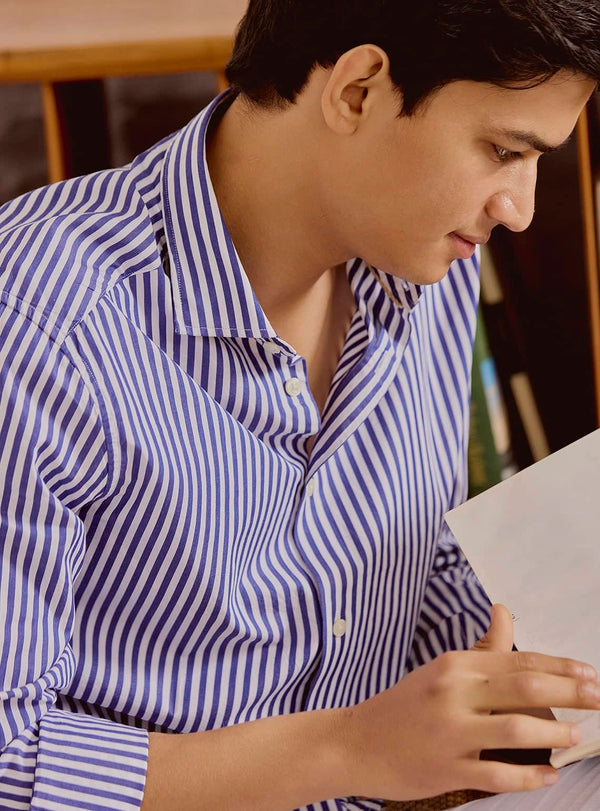 This shirt is meticulously crafted from cotton in a plain weave, ensuring comfort and breathability. Designed in a full-sleeve silhouette, it not only provides sophistication but also features a cutaway collar, stripes, & Rajan, the mark of Andamen.
