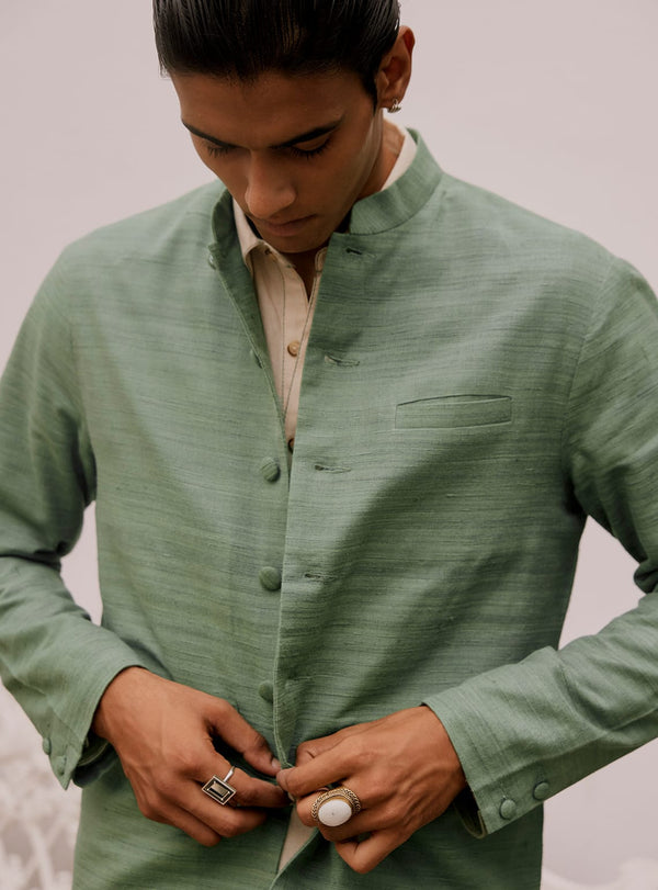 Introducing the Tej Silk-Cotton Jacket, a contemporary style rooted in Indian heritage.In a soothing sage green, this Nehru jacket is crafted from an indulgent blend of silk and cotton. The fabric, woven on a traditional, eco-friendly handloom, combines the lustrous sheen and drape of silk with the softness and durability of cotton. This ensures a royal hand feel and a comfortable wear experience.This popular, sought-after style has a clean, neatly built classic silhouette with pocket play.Layer it over our fresh kurta-pyjamas or pair it with khaki linen pants for a modern, sophisticated look.Built on a legacy of excellence, each hand-crafted piece features minor variations in shade and texture, making it truly one-of-a-kind.Part of the MIRAI collection, where contemporary styling meets heritage fashion.