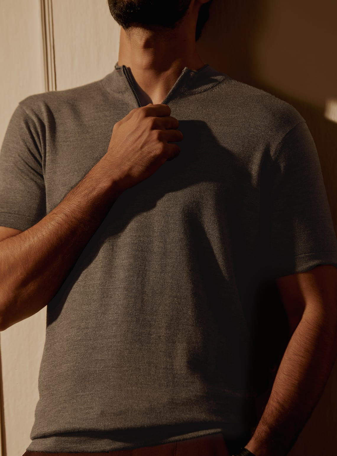 This mock-neck polo is as comfortable as it is sophisticated. The rich, super silky fabric ensures optimal thermal regulation, & the craftsmanship is truly exceptional. This is a classic piece and great value considering it'll endure in your wardrobe for years to come. Think of styling it with our light achromatic chino, or with a suit for a cocktail dinner. Features tipping detail.