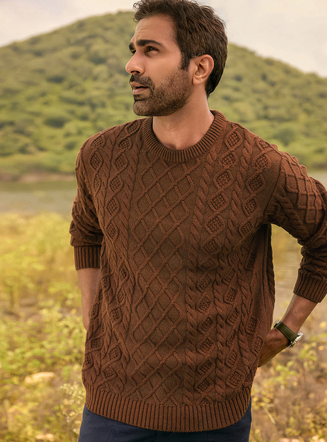 Woven from mélange yarns that blend multiple shades for depth, this cotton cable pullover exudes quiet strength with a rich, textured surface.