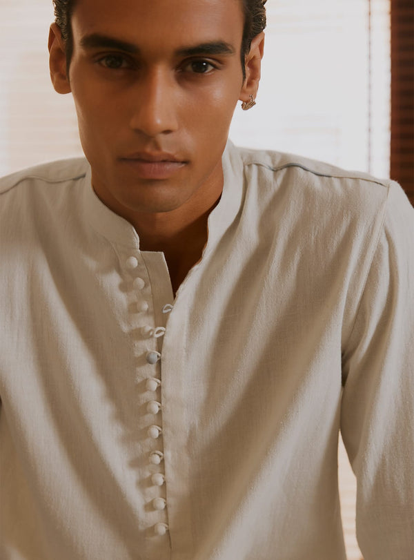 Presenting the Sneh Khadi Shirt, a contemporary style rooted in Indian heritage.Crafted from 100% handspun cotton by skilled artisans, this off-white full-sleeve shirt features elegant potli buttons and refined piped detailing, adding just the right amount of traditional touch. With its softness elevated to an art and eco-friendly dyes, this garment offers a unique texture that caresses the skin, ensuring a super comfortable wear.Pair this versatile silhouette with linen pants to tie the look together, creating an elevated and elegant ensemble.Built on a legacy of excellence, each hand-crafted piece features minor variations in shade and texture, making it truly one-of-a-kind.Part of the MIRAI collection, where contemporary styling meets heritage fashion.