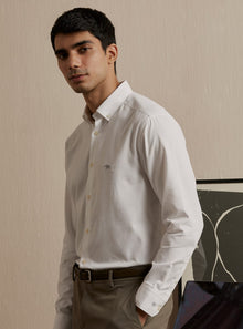 This shirt is meticulously crafted entirely from cotton in a dobby weave, ensuring comfort and breathability. Built for you in a button-down collar, it makes you look sophisticated. Features textural brilliance, & Rajan, the mark of Andamen.
