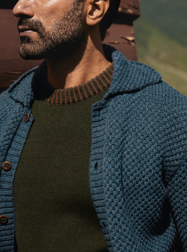 Feast your eyes on some of the toughest styles in our arsenal yet. Built from a cotton & wool blend, instantly increasing its insulating properties, this heavy-duty style is built to weather any storm. Showcases hyper-textures that enhance garment stretch, assist in thermoregulation, & add a lot of character to your cardigan. Tested to its limits, this piece will withstand time, lasting for years to come. Features Rajan, the mark of Andamen.