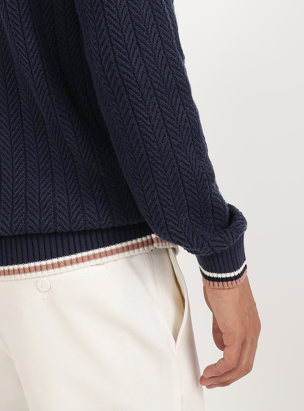 - 1x1 rib with contrast tipping at sleeve cuff and bottom hem