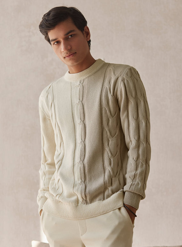 This pullover is crafted from a blend of locally sourced cotton, the superior quality of the yarn combined with our meticulous craftsmanship ensures your garment is as comfortable as it is long-lasting, and the addition of wool adds thermoregulation properties to the garment. Features cables, & Rajan, the mark of Andamen.