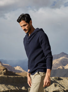 Presenting a winterwear style from our iconic Escape collection. Elevated & resilient, this garment is made entirely from a rich Indian cotton & woven in a flat knit structure. Designed to be snug, durable & comfortable to wear, this garment is made for the long haul. Features a hood & button closure at the neck.