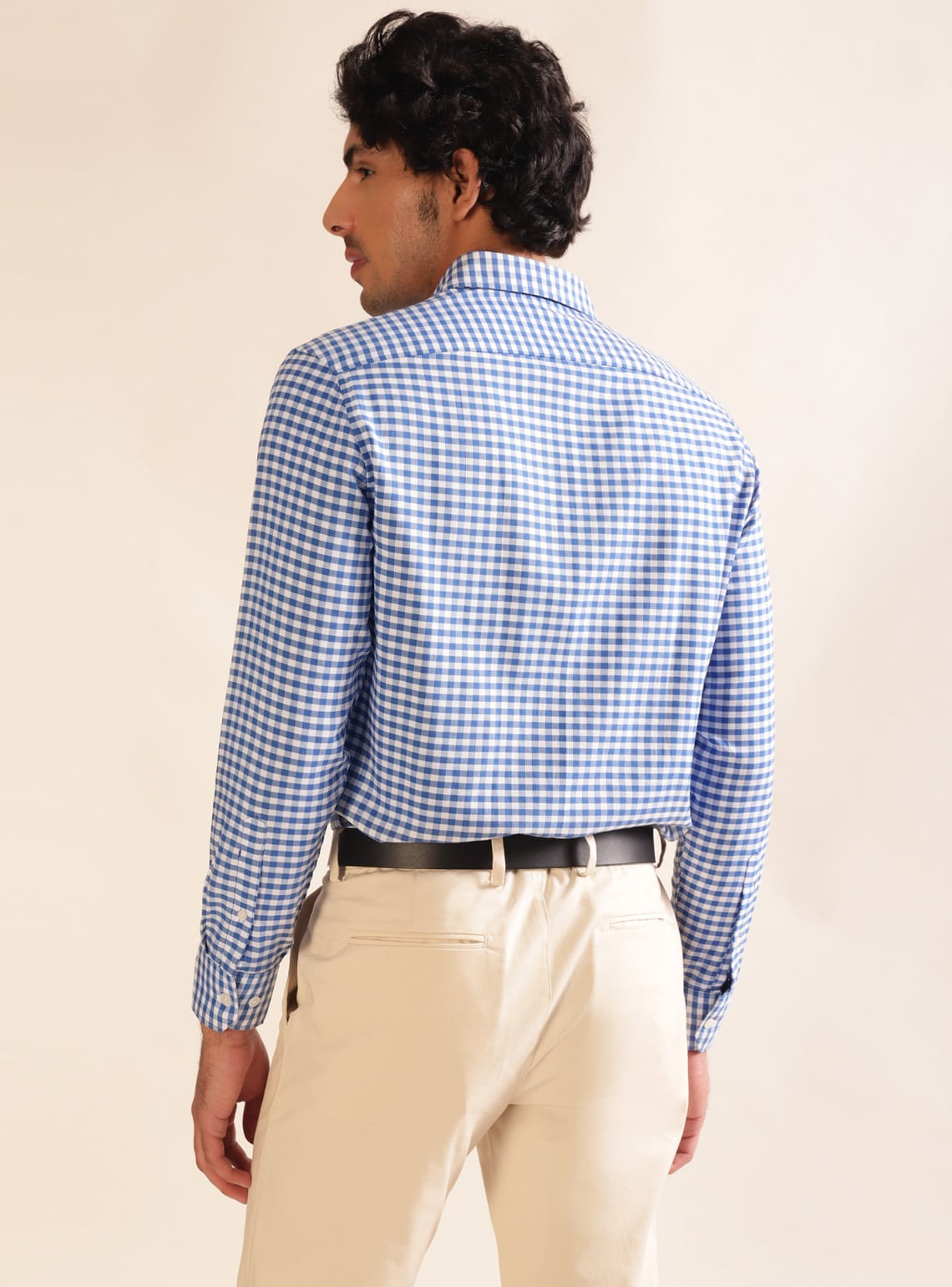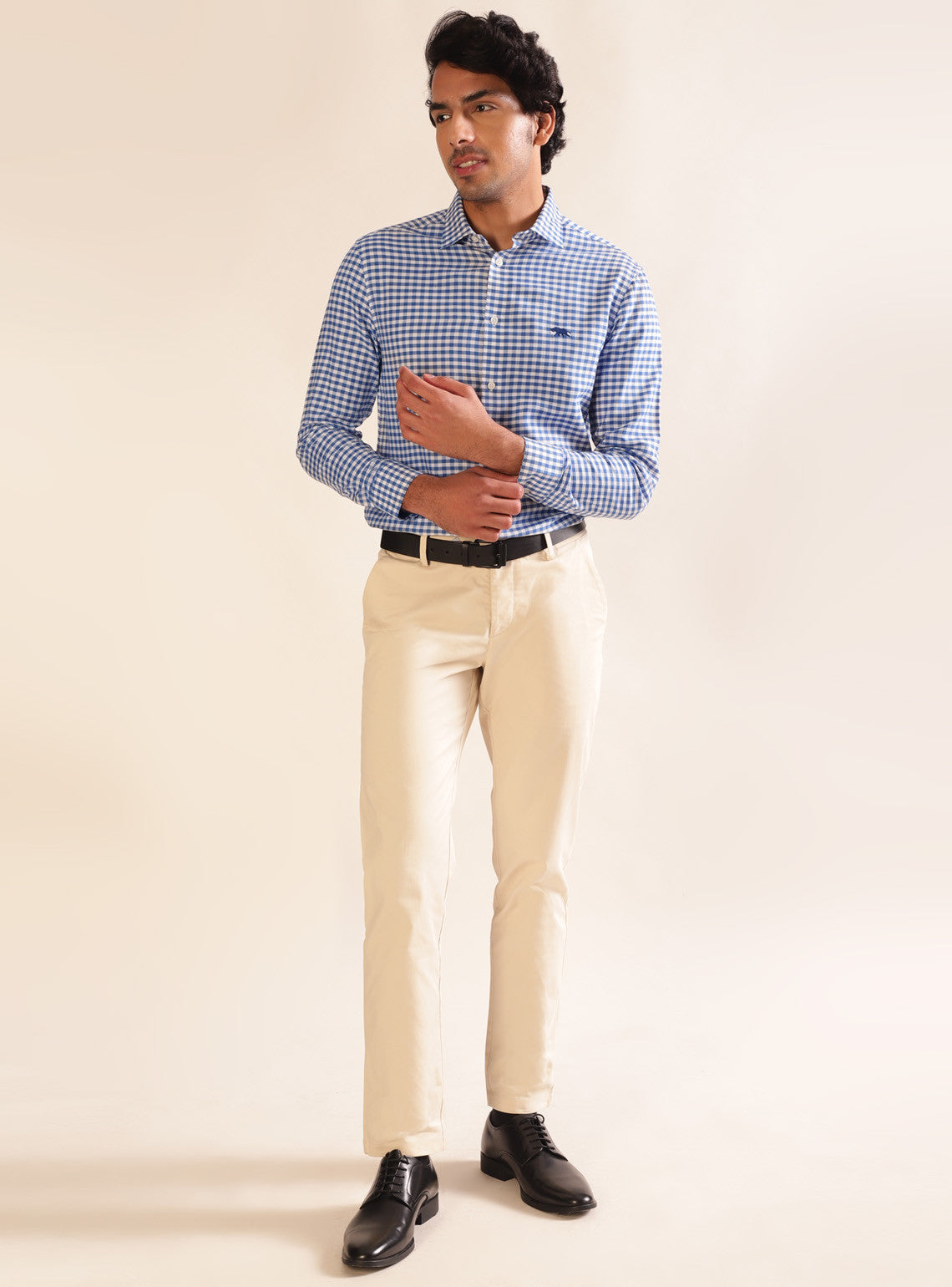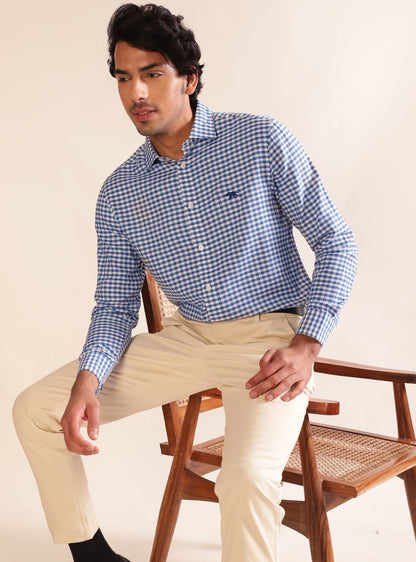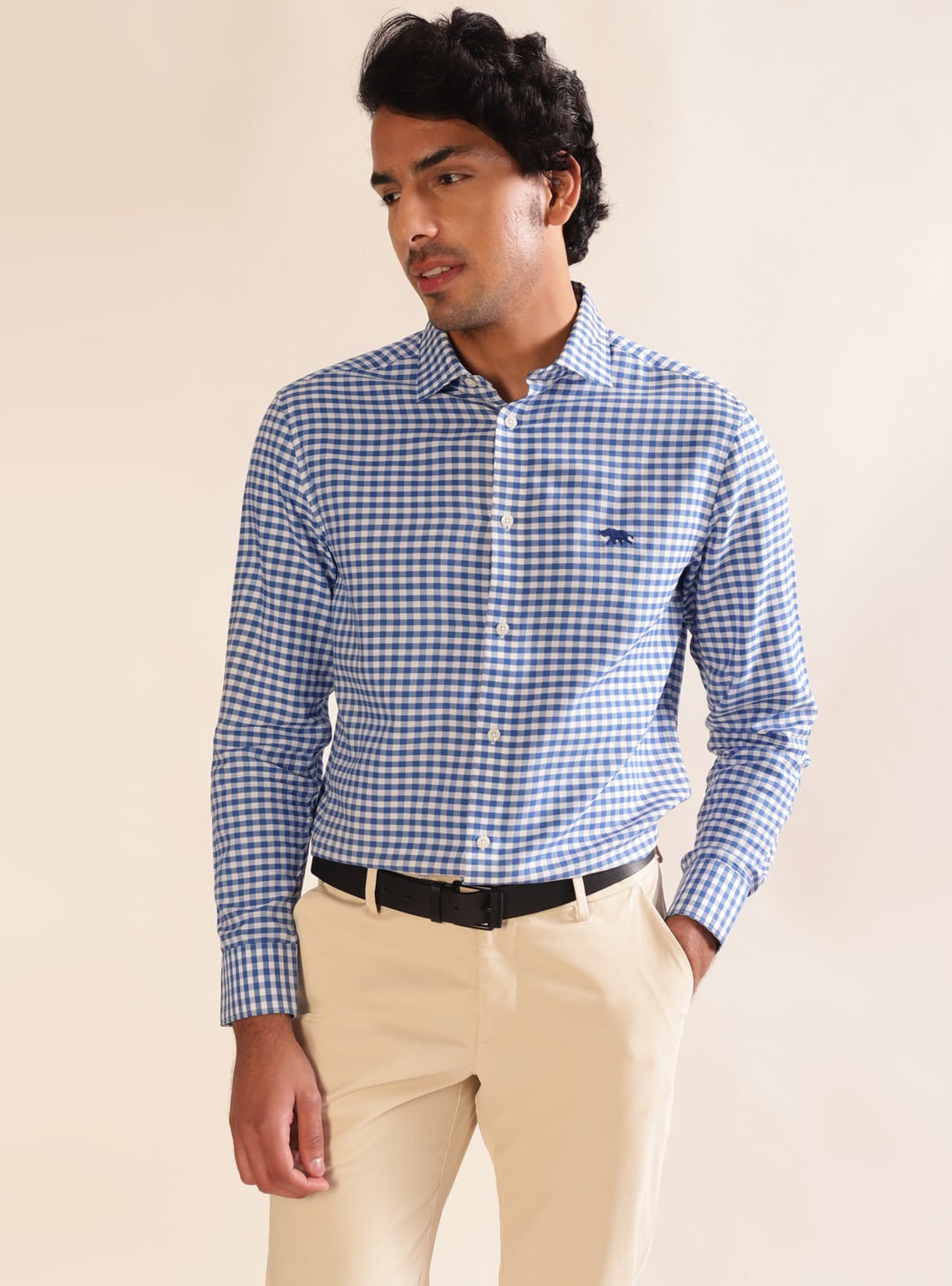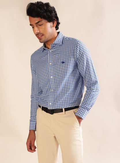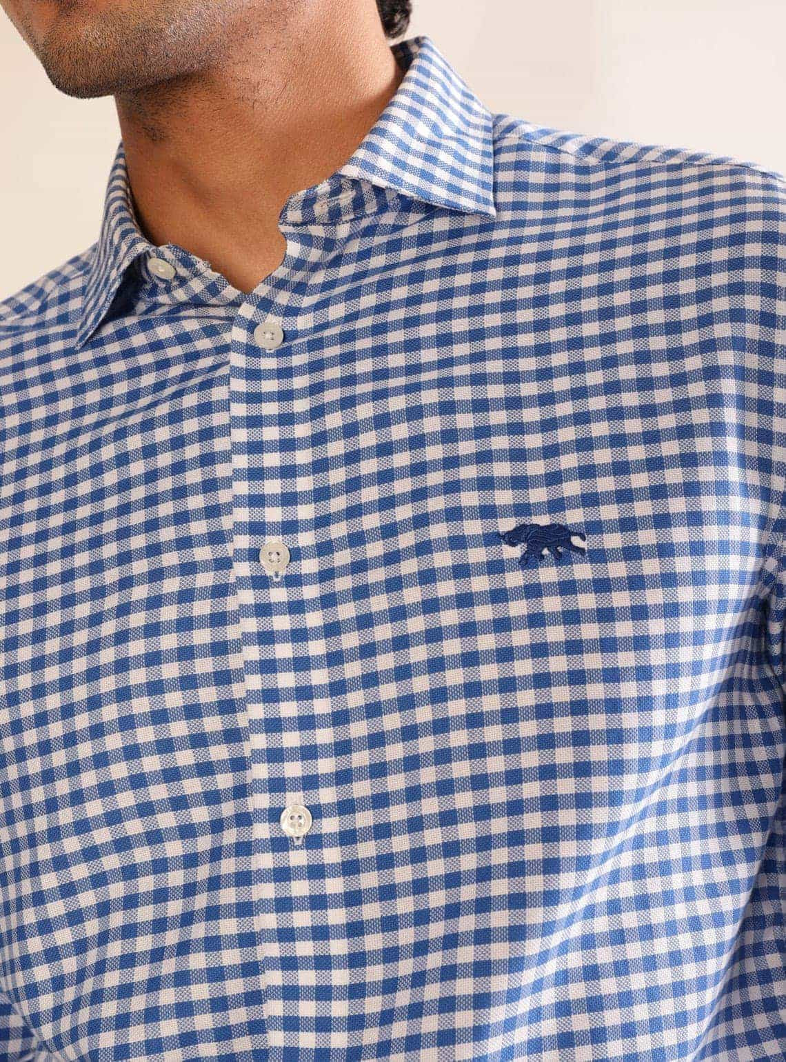 This shirt is meticulously crafted from cotton in a dobby weave, ensuring comfort and breathability. Designed in a full-sleeve silhouette, it not only provides sophistication but also features a cutaway collar, checks, & Rajan, the mark of Andamen.